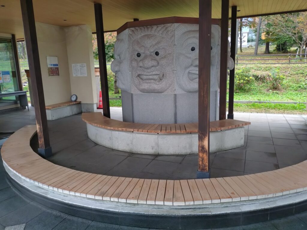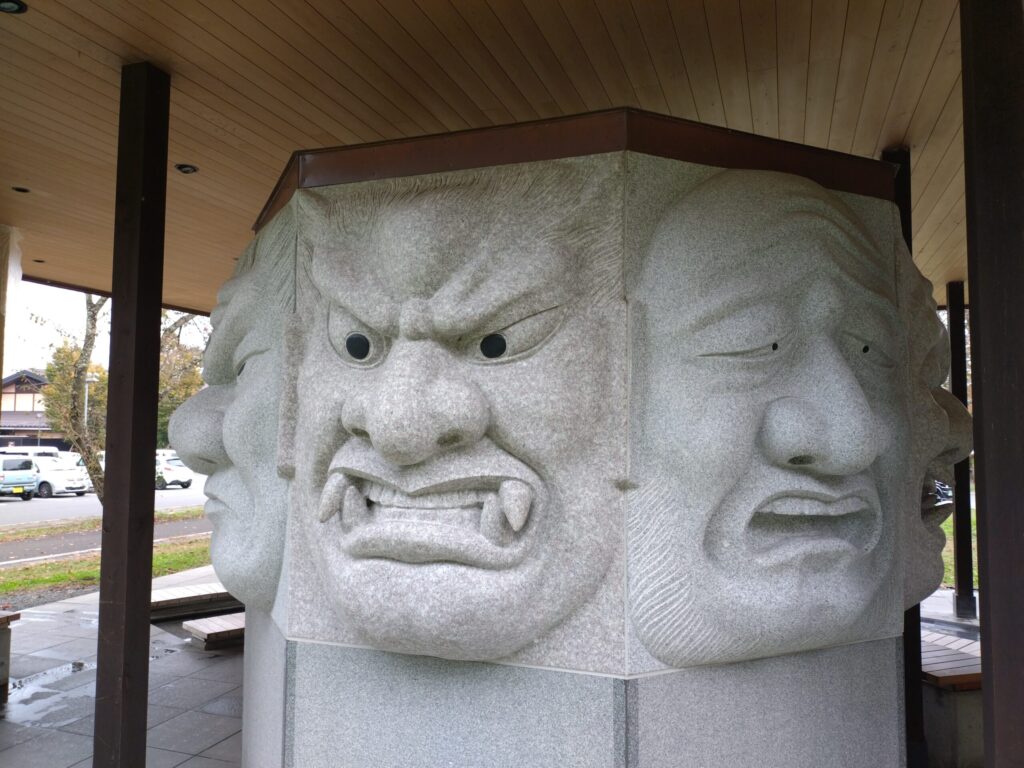 足湯のすぐそばには、伝説の鬼神「八面大王」をかたどった迫力あるモニュメントが立っています。