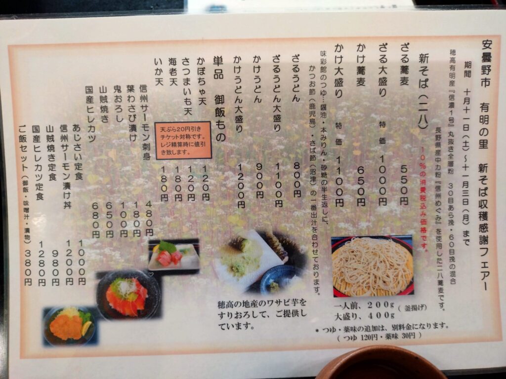 10月11日から開催されていた「新蕎麦収穫感謝祭」期間中はなんとざるそば1人前が550円という特別価格!安曇野のおろしたての生わさびが添えられ、安曇野らしい味わいを堪能できました。