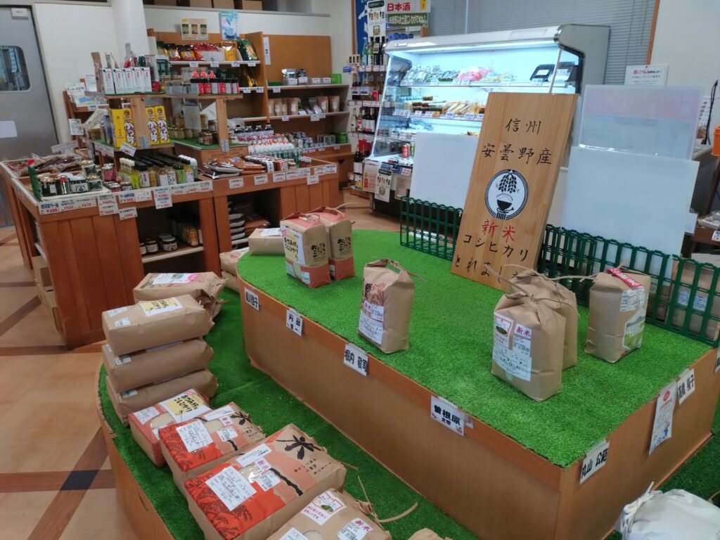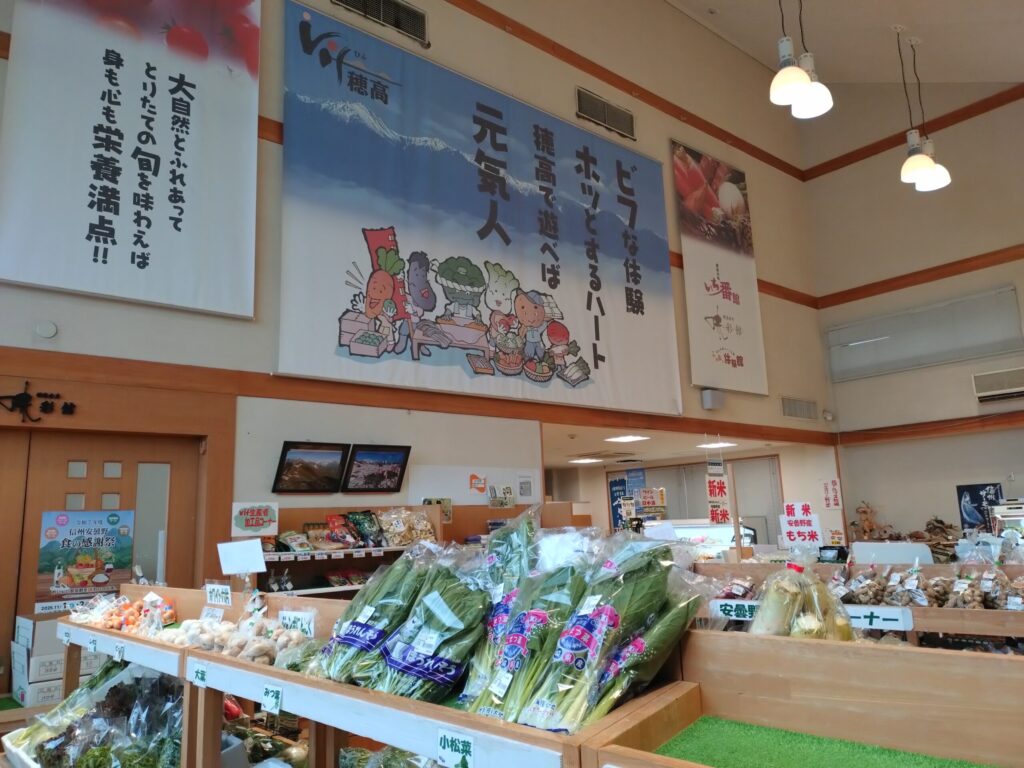 地元農家の新鮮な野菜や果物を販売する直売所のほか、食事処や体験施設も併設されており、安曇野の食と暮らしをまるごと楽しめるスポットです。