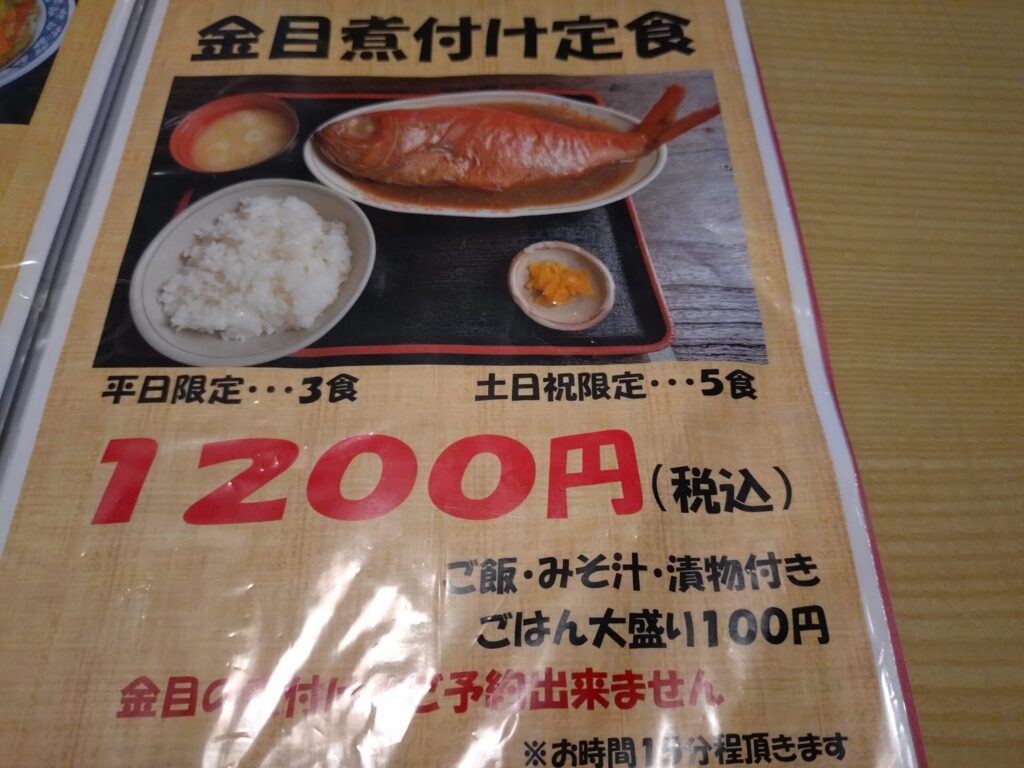 定食メニューも魅力的。金目の煮つけ定食もこの価格です。ただしこちらは、平日3食、土日祝日は5食限定とメニューに書いていました。