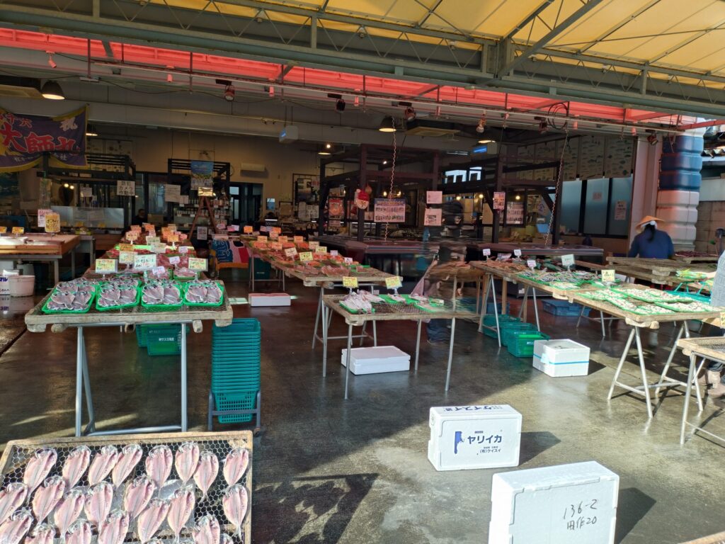 沼津港へ到着して早速市場で買い物。店内には、おいしそうな魚や立派な干物がずらり。