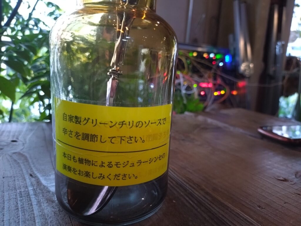 テーブルの上には、スプーン立てとして使われている瓶が置かれていて、「自家製グリーンチリのソースで辛さを調節してください。」と書かれています。