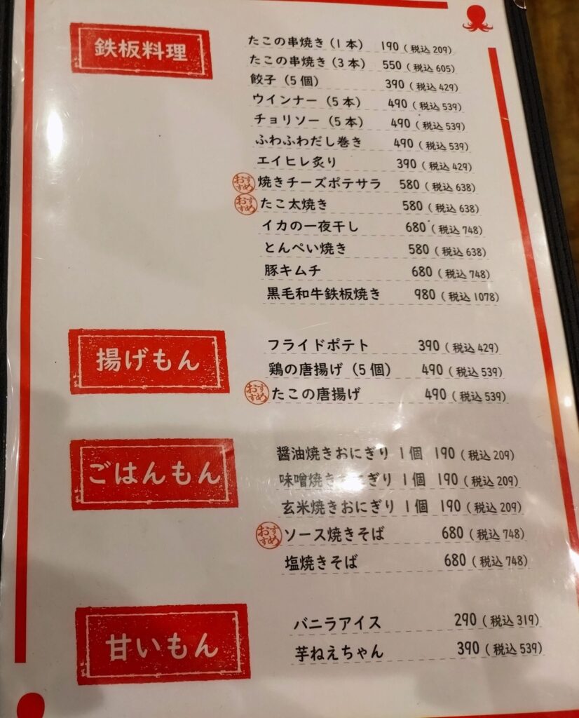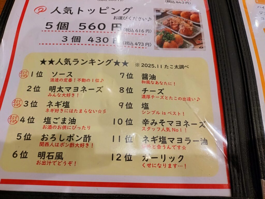 メニューに載っていた、たこ焼きの「人気ランキング」。定番から変わり種までそろっていて、どれにするか思わず迷ってしまいます。