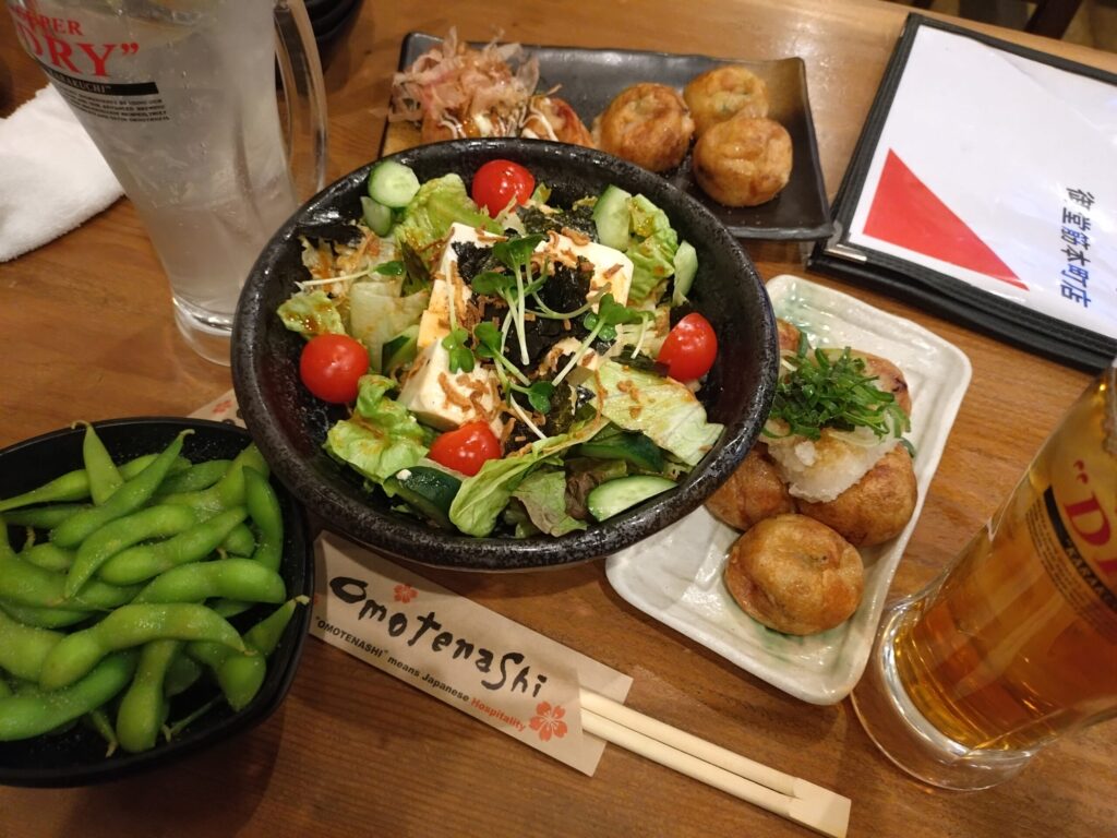 とりあえず注文したのは、「たこ焼き」と「たこ太サラダ」、それに「枝豆」。たこ焼きは、たしか「ソース」と「おろしポン酢」の2種類だったと思います。