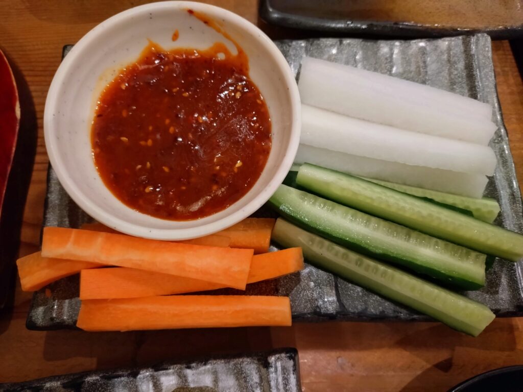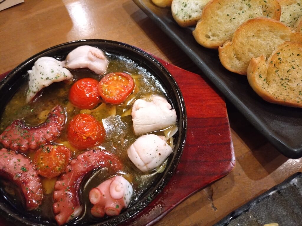 追加で「たこのアヒージョ」と「野菜スティック」を注文。たこ焼きだけでなく、軽くつまめる一品もいろいろそろっています。